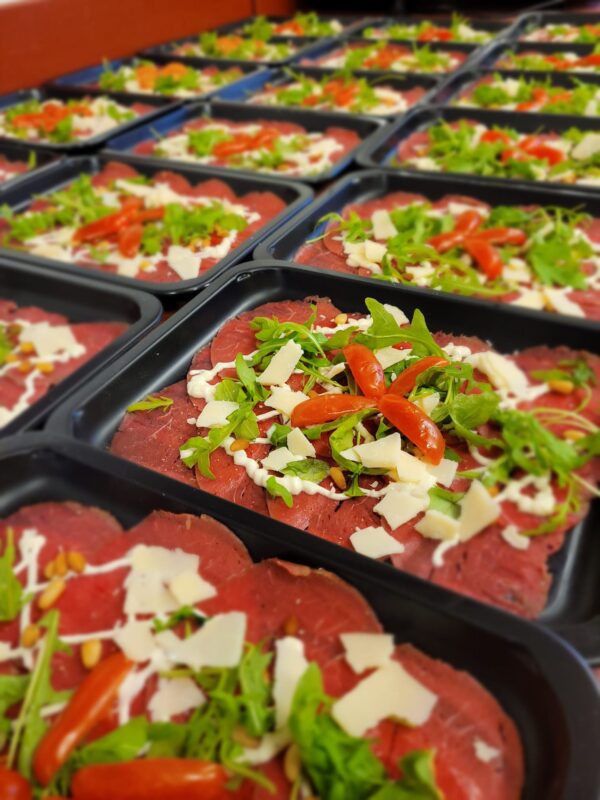 Schoteltje carpaccio lekker opgemaakt met parmezaanse kaas, pijnboompitjes, rucolasla en een lekkere dressing. Per portie 60 gram gesneden carpaccio.