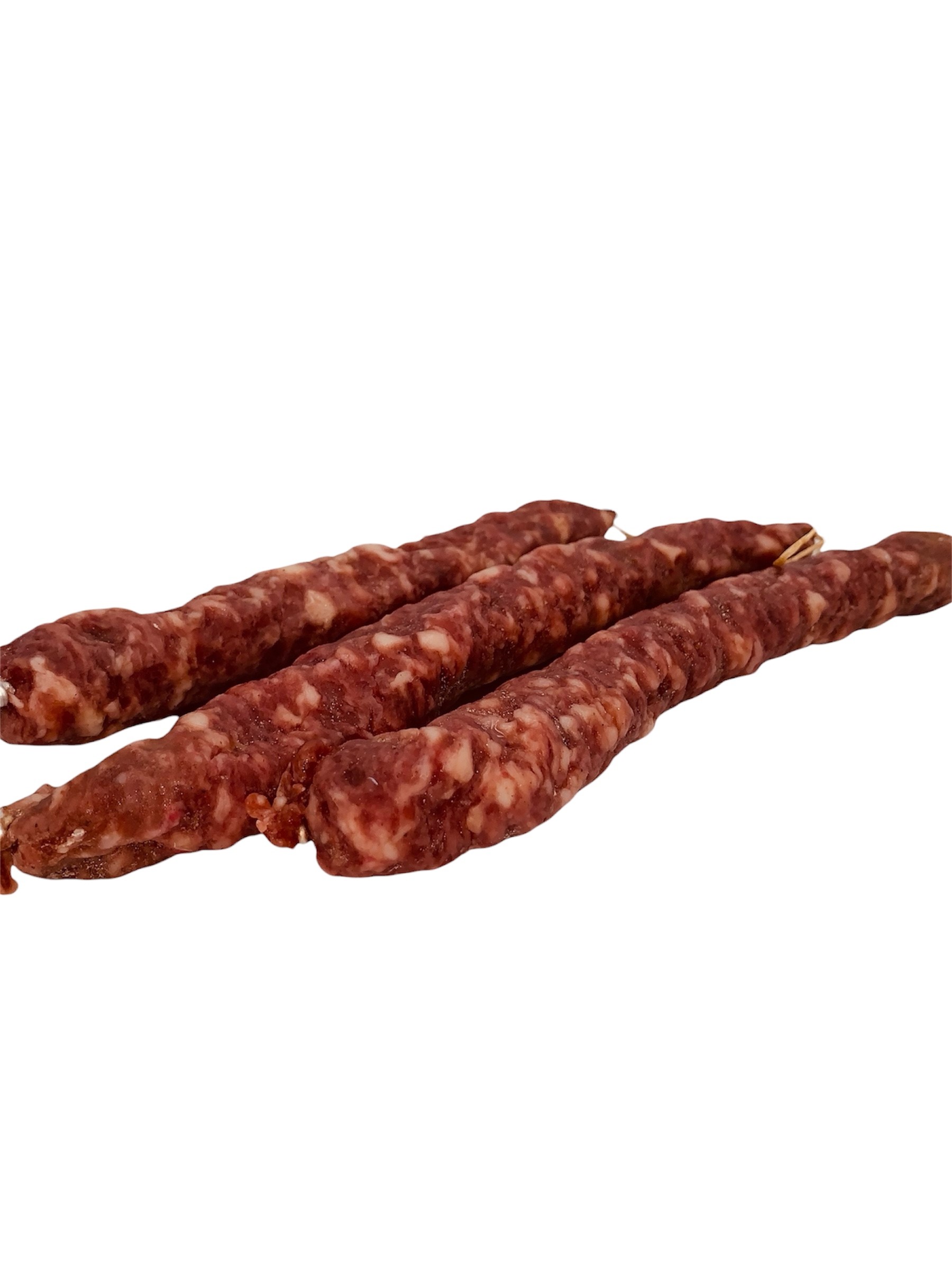 | Ingrediƫnten | varkensvlees, zout, conserveermiddel:, natriumnitriet, peper, wit, dextrose, keukenzout, kleurstof:, E, 120, karmijn, lavaswortel, foelie, koriander, starterculturen:, (Staphylococcus, carnosus, Lactobacillus, plantarum) |