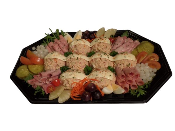 Salade gegarneerd met diverse soorten fruit en ambachtelijke vleeswaren. Prijs is per persoon! Geef hieronder het gewenste aantal personen aan (minimaal 3 pers.).