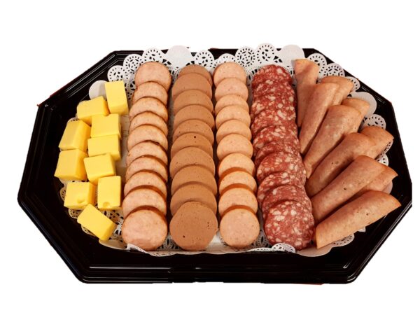 Koude hapjes à 60 stuks per schaal bestaande uit: Jong belegen kaas blokjes, Grillworst, Boterhamworst met augurk, Fijne leverworst, Boerenmetworst en Kookworst.