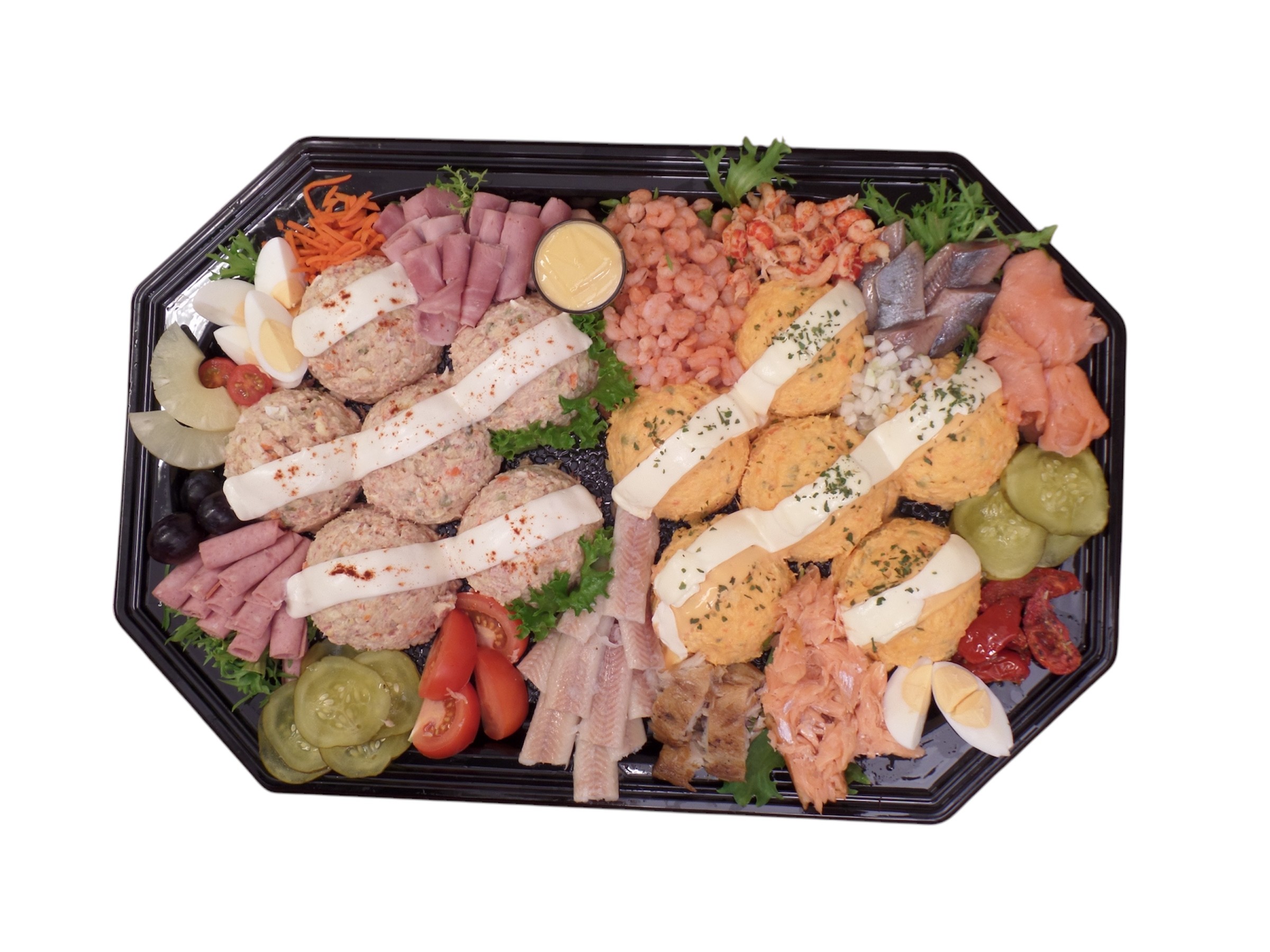 Huzaren- en zalmsalade gegarneerd met diverse soorten vis, fruit en ambachtelijke vleeswaren.
